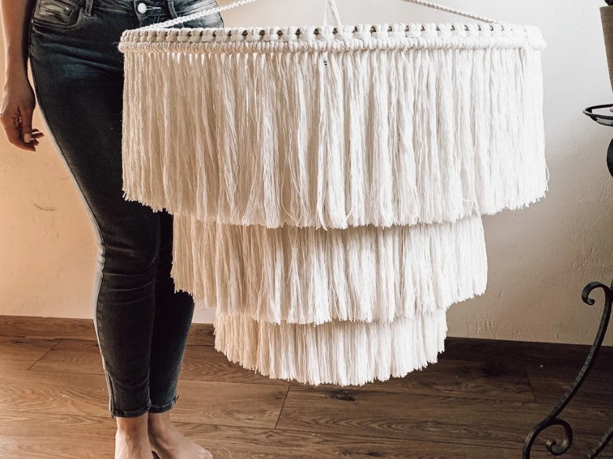 Bohemian Design: Featuring intricate macrame patterns and elegant fringe, this chandelier is the epitome of boho chic, perfect for enhancing your dƩcor with its artistic flair.