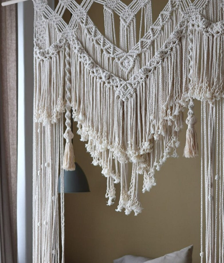 These hand-knotted wall hangings and curtains are as beautiful as they are versatile. They can be used to bring texture and creativity to any space. The Large size can be used as a wall hanging or hung over a window or door frame for that perfect bohemian feel. It can also be used as a gentle room divider that creates privacy but without closing off your space.